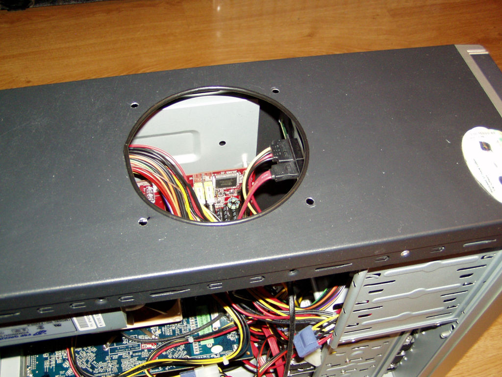 Plech, ze kterého je vyrobena skříň, není žádný zvláštní ocelák, vyříznutí otvoru pro ventilátor nebyl žádný zvláštní problém. Nejdříve jsem samozřejmě vyměřil pozici, vyvrtal díry pro šrouby a označil samotný otvor. Ten jsem volil o průměru 120mm, tedy o pár milimetrů větší, než je samotný průměr tunelu ventilátoru. Počítal jsem samozřejmě s budoucím olemováním otvoru. Samotné vyříznutí otvoru jsem provedl přímočarou pilou nejpodřadnější kvality, ovšem s relativně kvalitním řezacím plátkem HSS. I tak si myslím, že vyříznout by to snad šlo i kuchyňským nožem, plech na skříni je skutečně papírový.