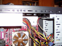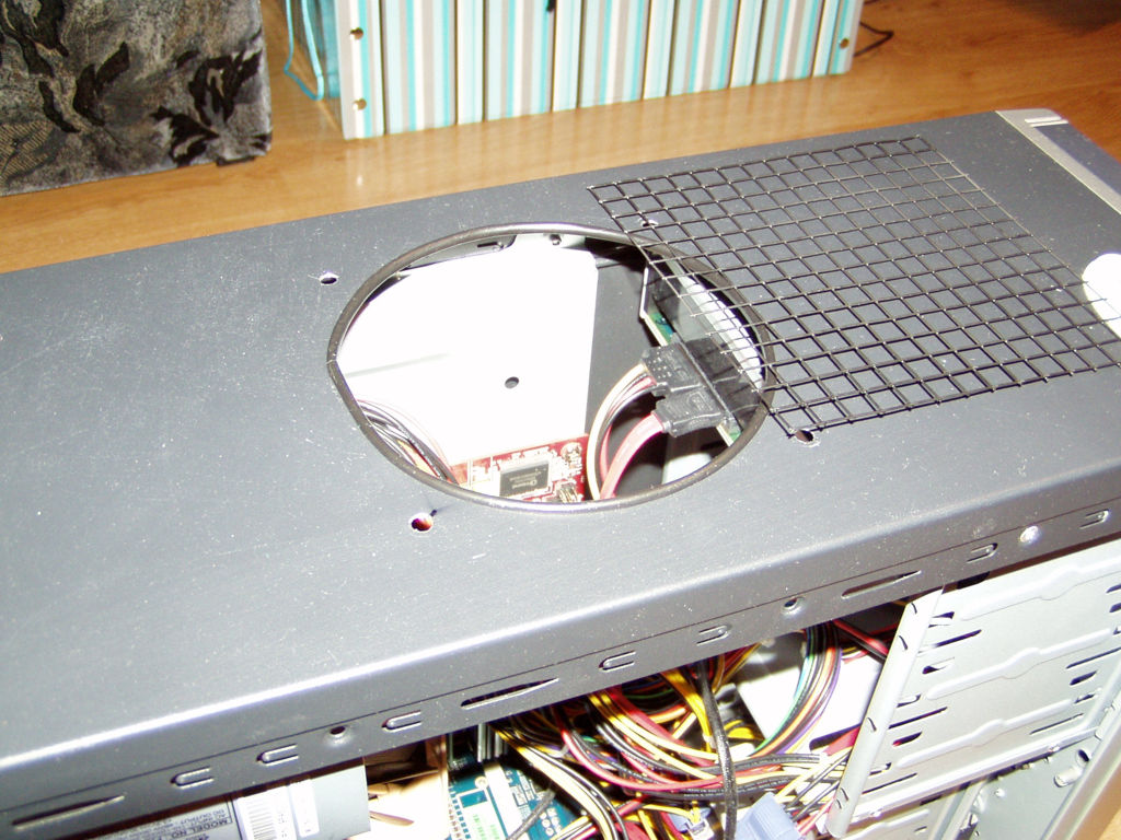 Do vzniikého oválu už jde přímočará pilka. No a pak jsem se jen musel snažit řezat otevírající se spirálu a napojit tak na kružnici otvoru. Špatně se to ukončuje, přímočarka jde ke konci cestou nejmenšího odporu a má tendenci sjet do středu, tam kde už není žádný plech (celou dobu předtím by zase jela rovně, ale to se koriguje dobře). Takže finále má půlkulatý pilník, ale na těch skříních není žádná legovaná ocel, tak to není problém.Místo pro ventilátor bylo prakticky dané skříní, jinam bych tu 120mm mrchu nedal - není místo. Ale komp. mám schovaný pod deskou stolu, tak to s kafem ani s kolou není problém. Líbila by se mi právě ta v úvodu popisovaná kombinace - zdroj na podlaze a 120mm vent. na zadní stěně nahoře. Ale takhle to budu řešit až v příštím PC. (Dá se to ještě třeba u synova počítače - má po mně zděděný Yeon Yang, který má vzadu pozici pro 120mm vent. Zase je tam problém mřížka. Jsou to ty přiblblé čtverečky - docela slušný zdroj hluku. Musí se to vyříznout, nebo vystříhat a pak ještě začistit do hladka, aby to mělo význam. A protože tohle už je masivní materiál, jde to dost těžko. Navíc se naruší "statika" bedny.)Disky jsou nalepené na sobě, ale i takhle se dají díky tomu ventilátoru uchladit. V bedně je pro disky celkem pět pozic, využité mám 2, 3, 4. Šly by nacpat do 1, 3, 5, zkoušel jsem to, ale mám dojem, že na spodní mi pak už nestačila napájecí větev - musel bych zase bastlit nastavení napájení. A pozice úplně nahoře je hodně blokovaná gtafickou kartou. Tedy, karta a disk se tam vejde, horší už je to s instalací přídavného napájení do karty a kabelů do disku.