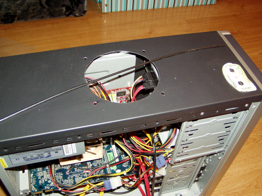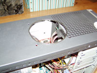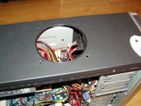 Podotýkám, že vyříznutí otvoru musí být provedeno při úplně vyklizené skříni počítače. Otvor je vhodné potom zabrousit pilníkem, hrany plechu jsou po oříznutí pořádně ostré. Po tomto doporučuji skříň důkladně vyluxovat a až poté opět začít s osazováním počítače. Na obrázku je již skříň osazena, tak ať vás to nemýlí.