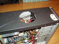Protože výchozí skříň má na zadní straně pozici pouze pro 80mm větrák, navíc krytou poměrně masivní mříží, rozhodl jsem se tuto pozici nevyužít. V této velikosti (80mm) bych musel zřejmě sáhnout po ventilátoru s otáčkami minimálně něco kolem 2000 otáček za minutu ke slušnému odtahu vzduchu. Navíc masivní mřížka by byla zřejmě zdrojem vyššího hluku. Musel bych vyříznout i tu a na zadní stěnu je přece jen použit masivnější materiál. Takže druhou možností bylo využít relativně volného místa v horní stěně skříně, mezi zdrojem a mechanikou. Po přeměření jsem zjistil, že 120mm ventilátor se sem v pohodě vejde.