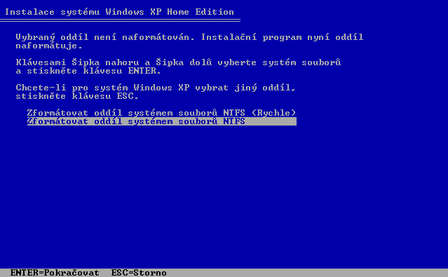 19. Zvolíme možnost Zformátovat oddíl systémem souborů NTFS a potvrdíme, jak jinak, klávesou Enter:
