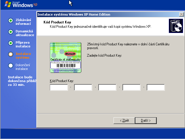 31. Zadáme platný Product Key uvedený na COA štítku a klikneme na Další: