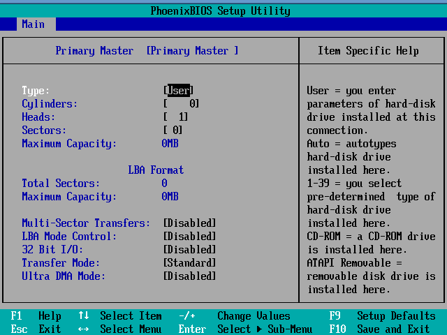 User - naposledy se používalo před lety, když si lidé nastavovali počet hlaviček / cylindrů / sektorů manuálně dle informací na disku: