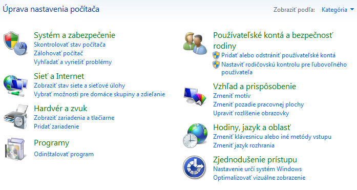 Určite viete, kde sa k týmto nastaveniam dostane - spustíte Ovládací panel, kde sa Vám otvorí okno a máte na výber z rôznych kategórií.