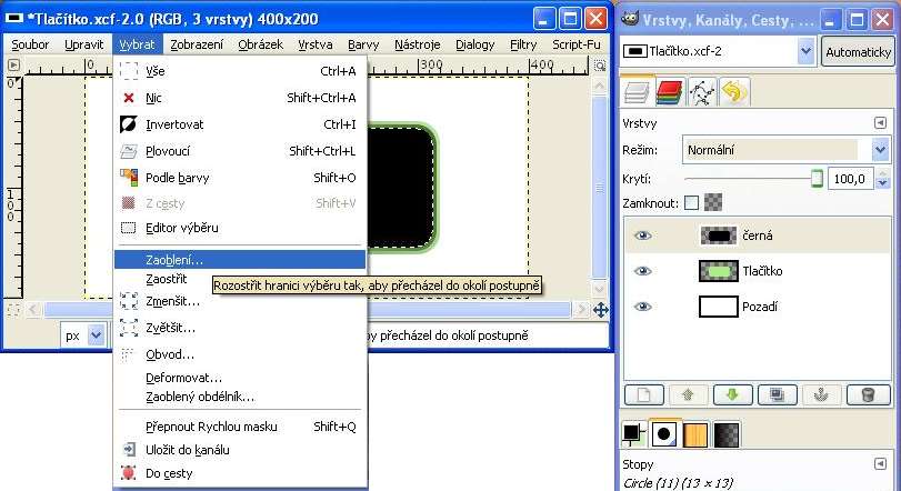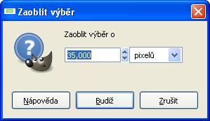 Následně zvolíme Vybrat -> Zaoblení... (např. 35px) a volbou Upravit -> Vymazat (na klávesnici Delete) odstraníme zaoblený výběr.