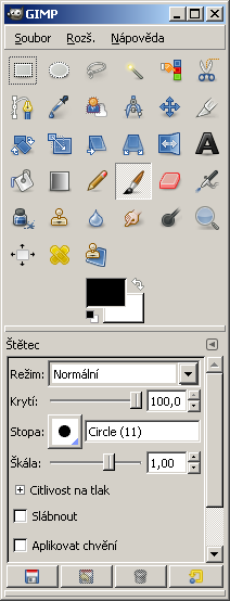 Když v tomto stavu vyberu nástroj např. štětec, již se mi dole zobrazí jeho nastavení jako je Režim, Krytí, Stopa apod. A to je přesně to, co potřebuji