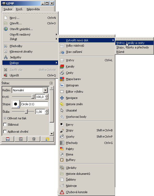 V tom případě kliknu na Soubor -> Dialogy -> Vytvořit nový dok a vyberu Vrstvy, kanály a cesty