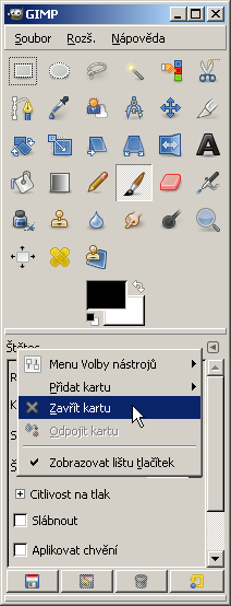 A k čemu v tomto místě vůbec potřebuji Historii změn? Nebo Vrstvy či Kanály? V tomto případě jen k tomu, abych tam vůbec nějakou kartu dostala a objevilo se mi kouzelné malé tlačítko se šipkou (na obrázku výše je červeně zakroužkováno). Toto nenápadné tlačítko mi totiž dovolí umístit pod panel nástrojů potřebná nastavení jednotlivých nástrojů. A to tak, že na něj kliknu levým myšidlem a vyberu Přidat kartu -> Volby nástrojů