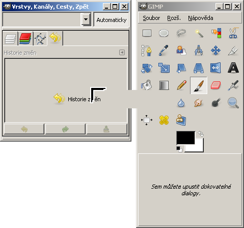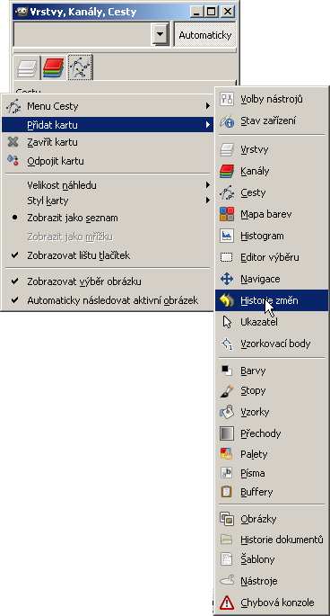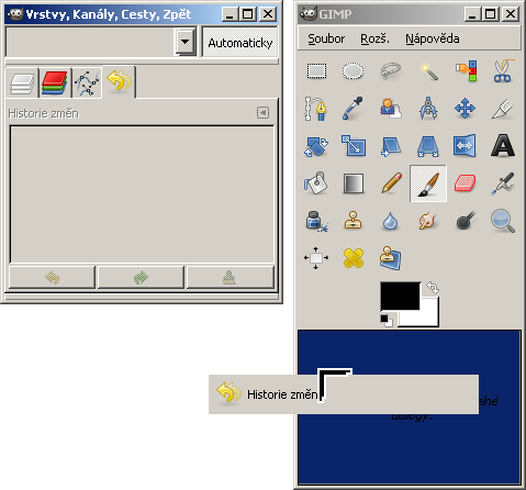 A proč zrovna Historii změn? Je to proto, že v okamžiku přesouvání karty Historie změn jsem ji měla aktivní. Stejně tak mohu mít aktivní kartu Vrstvy nebo kartu Kanály - a tehdy by se tyto karty přesunuly pod panel nástrojů.