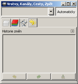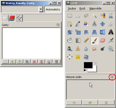 Proto na kartě Vrstvy, Kanály, Cesty umístím myš do prostoru pod tyto karty, kde se kurzor myší změní na ručičku (např. na obr. níže vedle textu Historie změn), stisknu levé tlačítko myši a táhnu šikmo do pravého dolního rohu