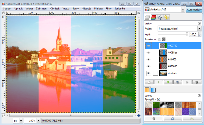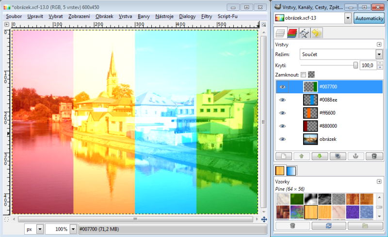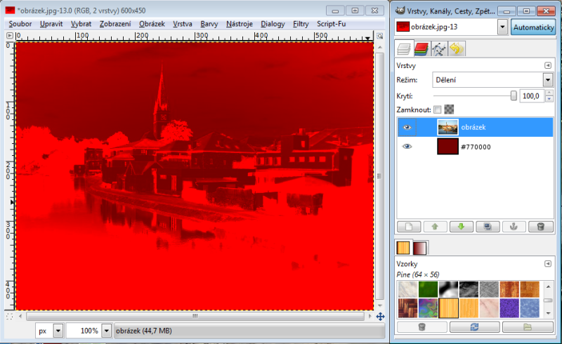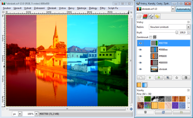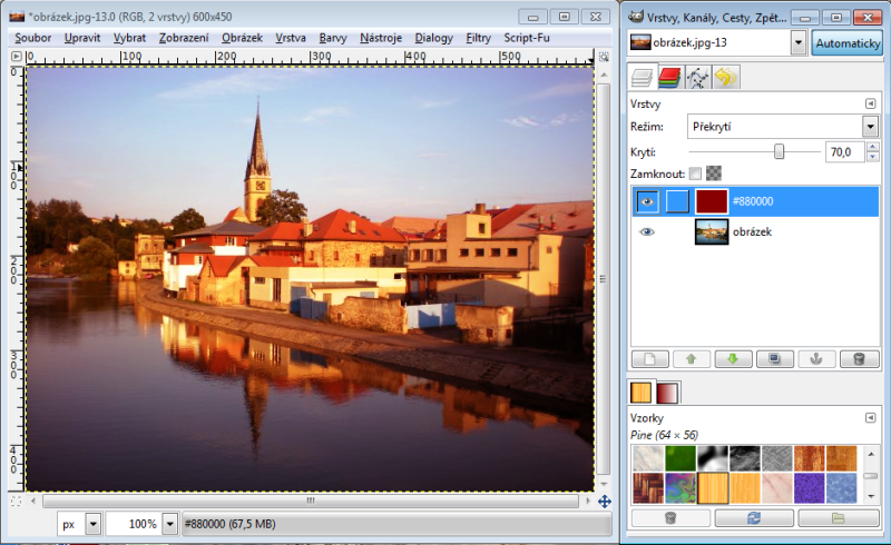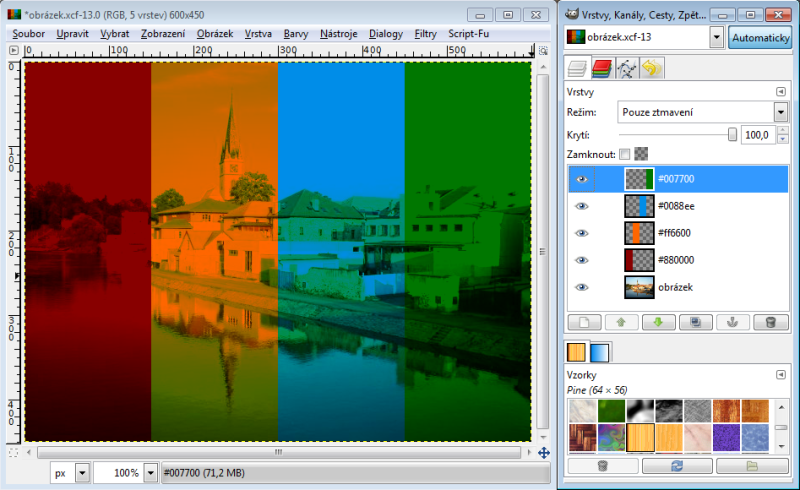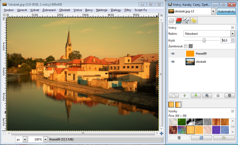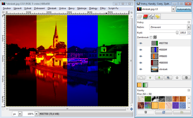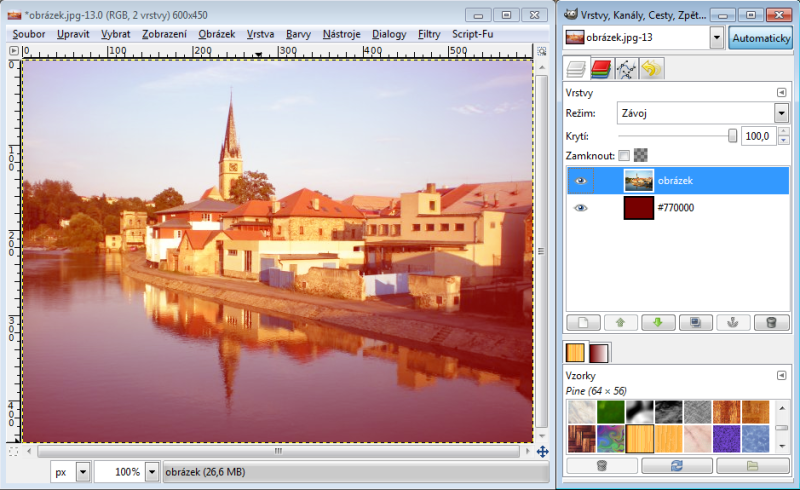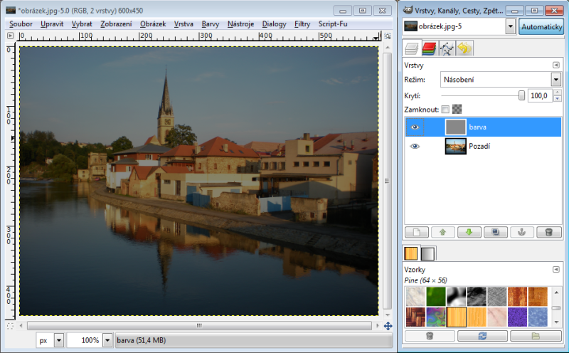 Nastavíme-li horní vrstvě režim násobení, tak výsledná hodnota červeného kanálu je 230 x 150 : 256 = 135 (zaokrouhlujeme běžně aritmeticky). Takže R = 135. Zelený kanál bude 100 x 240 : 256 = 94, modrý kanál 80 x 180 : 256 = 56. Tudíž výsledná barva v režimu násobení nám dá RGB 135-94-56. Račte si ověřit kapátkem v GIMPu