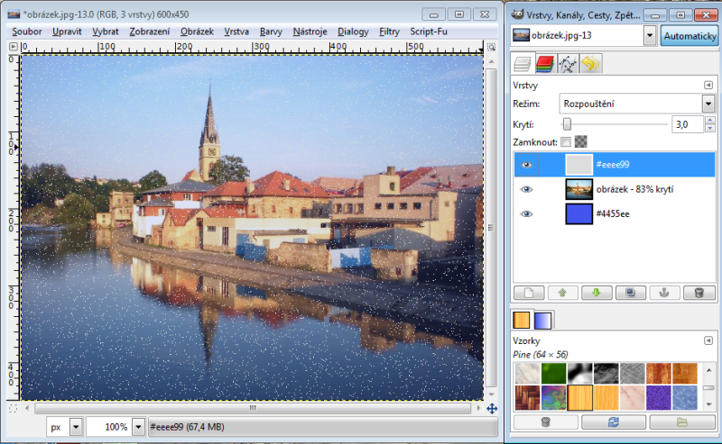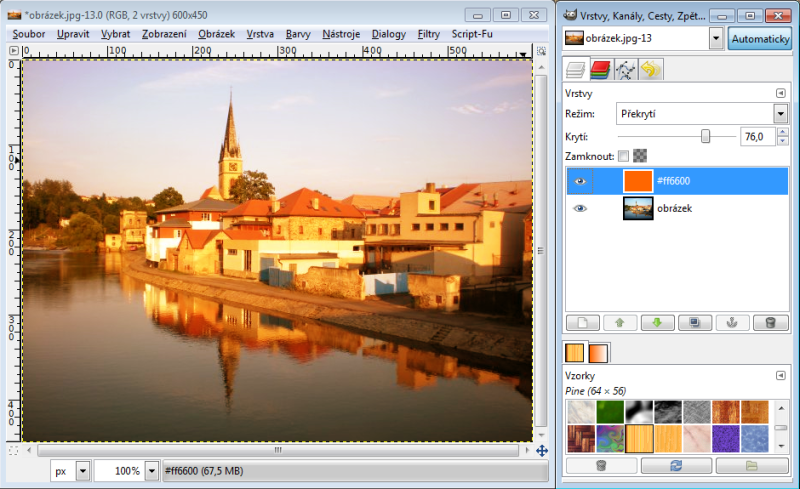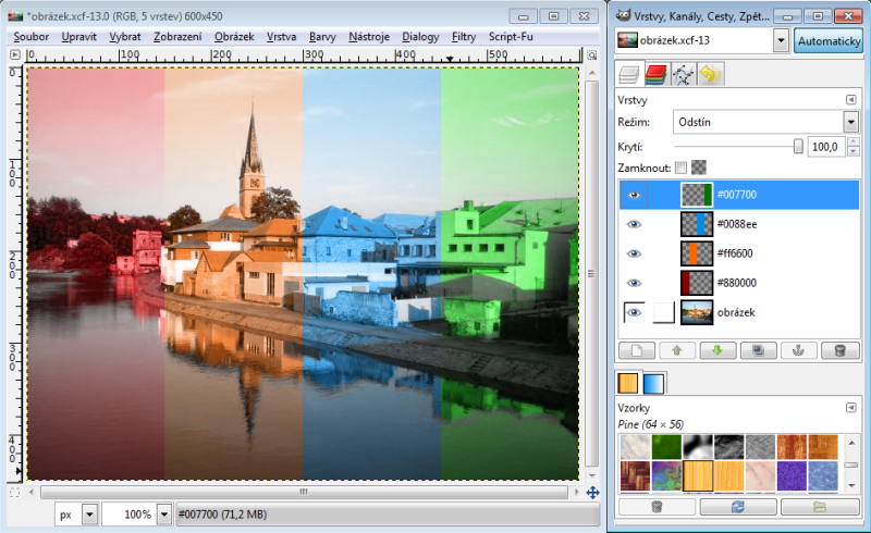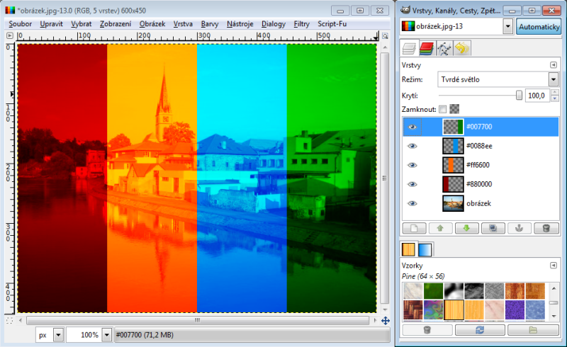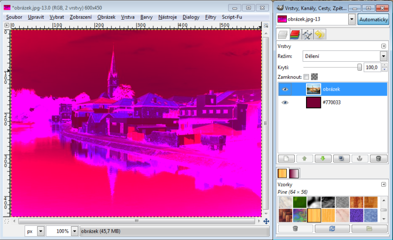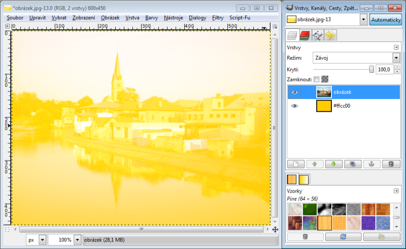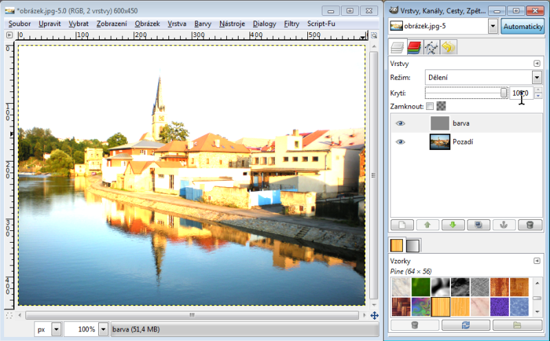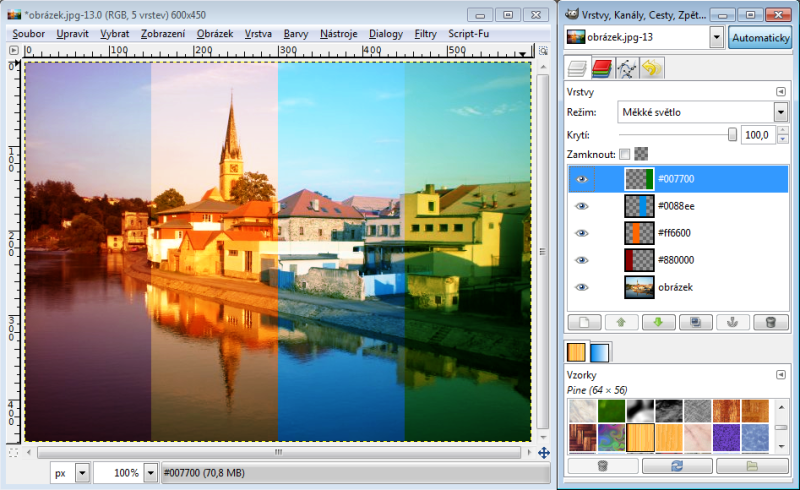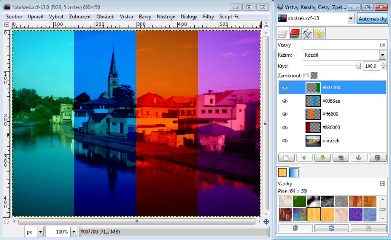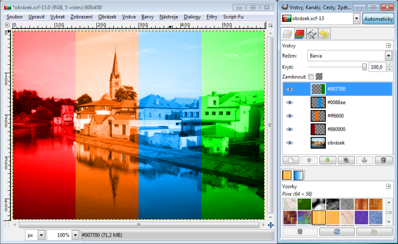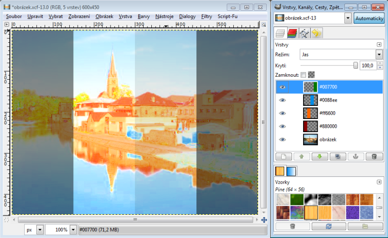 Nastavíme-li horní vrstvě režim násobení, tak výsledná hodnota červeného kanálu je 230 x 150 : 256 = 135 (zaokrouhlujeme běžně aritmeticky). Takže R = 135. Zelený kanál bude 100 x 240 : 256 = 94, modrý kanál 80 x 180 : 256 = 56. Tudíž výsledná barva v režimu násobení nám dá RGB 135-94-56. Račte si ověřit kapátkem v GIMPu