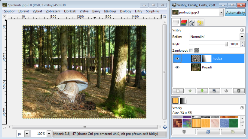 Spodní vrstvu tedy tvoří obrázek houbového lesa, horní vrstva obsahuje snímek (patřičně zvětšeného) hřiba a tato vrstva má přidaný alfa kanál.