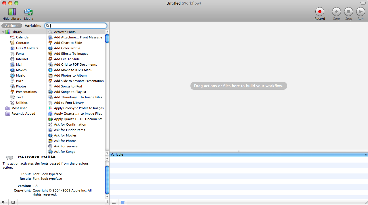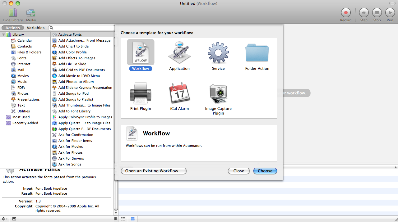 Napríklad "Service" vám umožní vytvoriť doplnkovú funkciu do ktorejkoľvek nainštalovanej aplikácie vo vašom systéme. "Folder action" zase funguje ako trigger a spustí sa pokiaľ sa zmení štruktúra zložky (pridanie, odstránenie súboru…). "iCal alarm" je klasické spúšťanie s naplánovaním na určený čas alebo dátum.