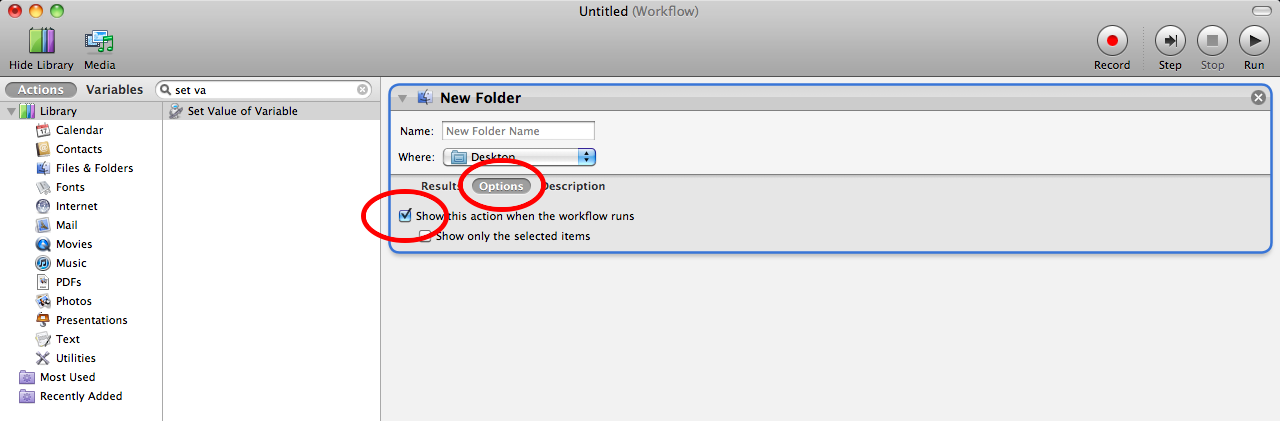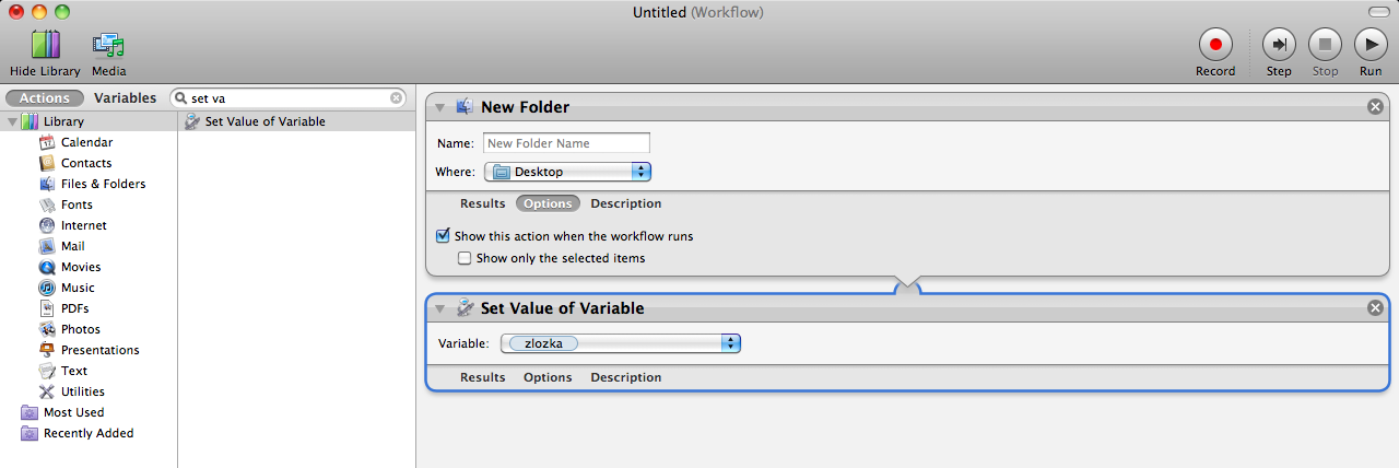 Vložíme teda blok s názvom "New folder" (funkcie je možné v Automatore vyhľadávať). V časti Options zaškrtneme "Show this action when the workflow runs", čo znamená, že sa používateľovi daný blok ukáže a bude môcť vyplniť názov súboru prípadne aj jeho umiestnenie počas behu aplikácie.