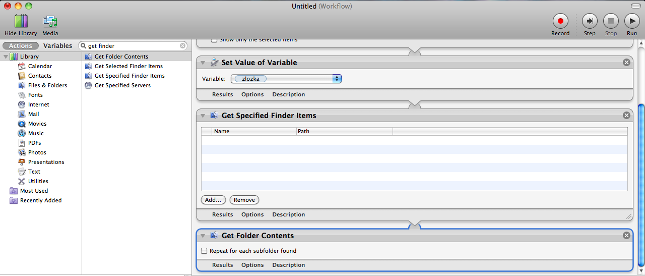 Ďalším krokom bude výber fotografií, resp. obrázkov. Na to potrebujeme blok s názvom "Get Specified Finder Items". Rovnako v časti options zaškrtneme, aby sa blok zobrazoval pri volaní a mohli tak požadované fotky vybrať. Keďže výber umožní vybrať aj zložku, je vhodné si situáciu ošetriť blokom "Get Folder Contents", ktorému zaškrtneme, aby rekurzívne prechádzal aj všetky podzložky.