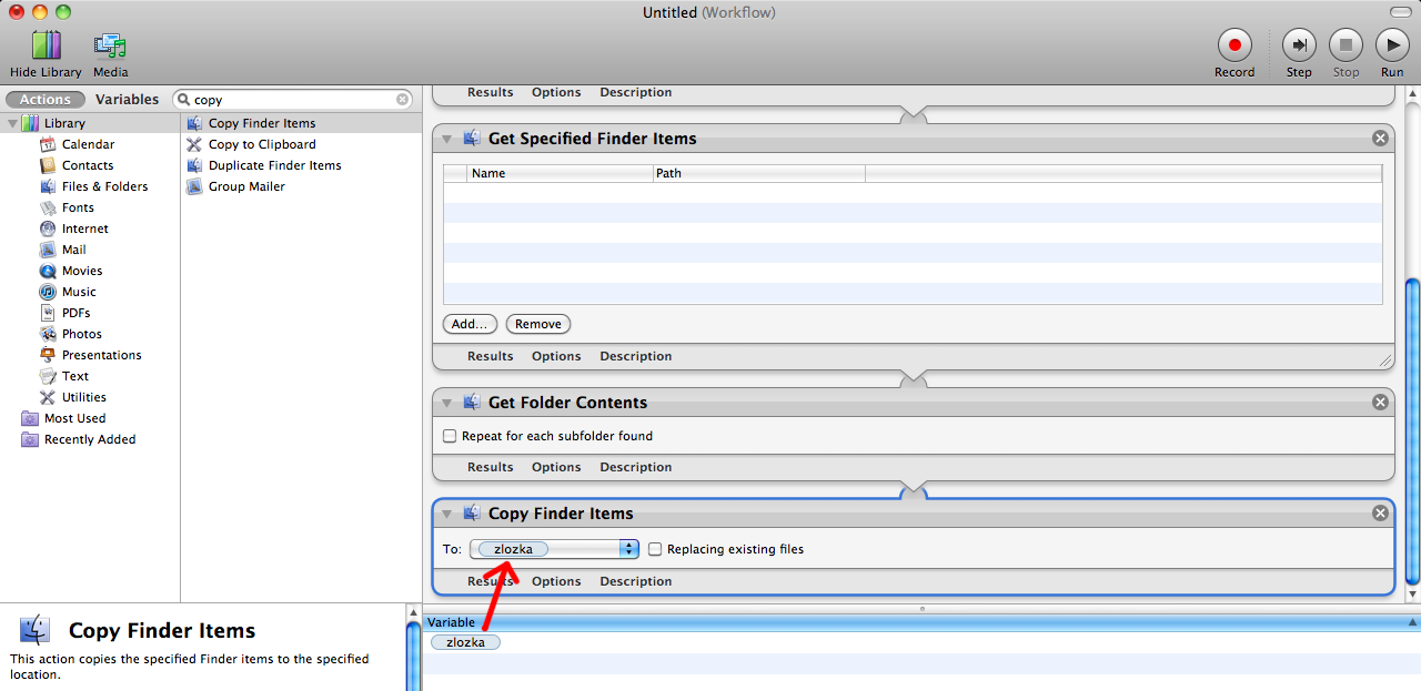 Teraz nastáva hlavná súčasť programu. Prekopírovanie vybraných fotiek do novej zložky. Do workflow potiahneme blok s názvom "Copy Finder Items". Aby sa prekopírovali do nami vytvorenej zložky, je potrebné premennú myšou zo spodnej časti potiahnuť na dropdown list "To:".