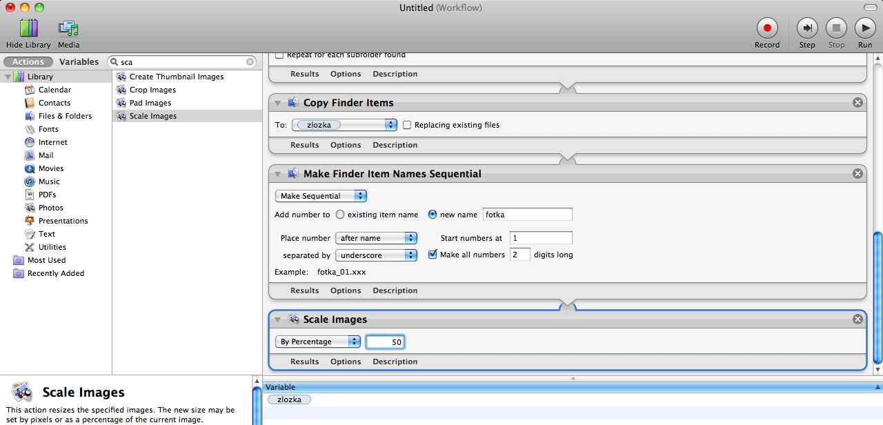 Ďalším krokom je premenovanie. Použijeme blok "Rename Finder Items". Nastavím, aby sa súbory premenovali sekvenčne tak, aby maska názvu bola "fotka_cc.xxx", kde 'fotka' je pevný reťazec, 'cc' je číslo odsadené nulou zľava a 'xxx' je prípona súboru.