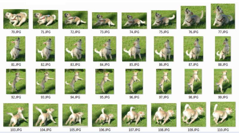 Vybraný soubor ve formátu AVI jsem si otevřela ve VirtualDubu - programu na zpracování videa. Mně šlo v jeho případě pouze o uložení jednotlivých frame, které by na sebe relativně dobře navazovaly a jejichž poskládáním vznikne ještě plynulý pohyb. Nedařilo se mi však uložit vybraná políčka filmu jako samostatný soubor, a tak jsem použila klávesu PrintScreen a vložila do Malování ve Windows. Rozlišení bohatě dostačovalo. U snímků fenky běžící po zemi stačilo vybírat frame ob jeden až dva, protože si byly navzájem velmi podobné, ale záběry ve vzduchu po jejím výskoku už nešly ošidit - příliš se od sebe lišily. Po vyselektování 20 vhodných rámů (angl. frames) nastal čas oddělit obrys psíka od travnatého pozadí a v případě tlapky schované v trávě tuto "domalovat".
