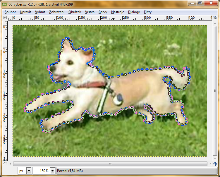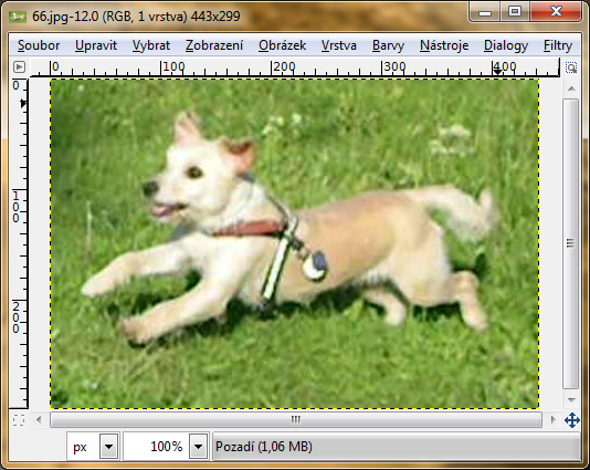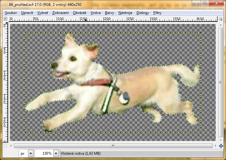 Tak. A je připravený první frame z celkových 20, které reprezentují výslednou animaci. Pokračujeme stejným postupem extrakce pejska z obrázku i u zbývajících políček. Když je někde tlapka příliš schovaná v trávě, stačí z jiného obrázku dát vhodnou část tlapky do výběru a jednoduše vkopírovat místo té chybějící. Vzhledem k malé velikosti obrázků si nemusíme dělat starosti, že by byl přechod vidět.