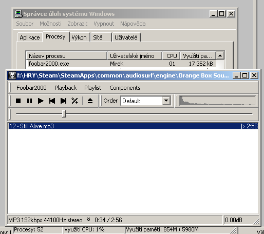 Můj právě přehrávající AIMP 3 po celém dni užírá přímo závratnou část RAM. Celých 10MB! Opera to zachraňuje, zabírá 3800,4 MB RAM.