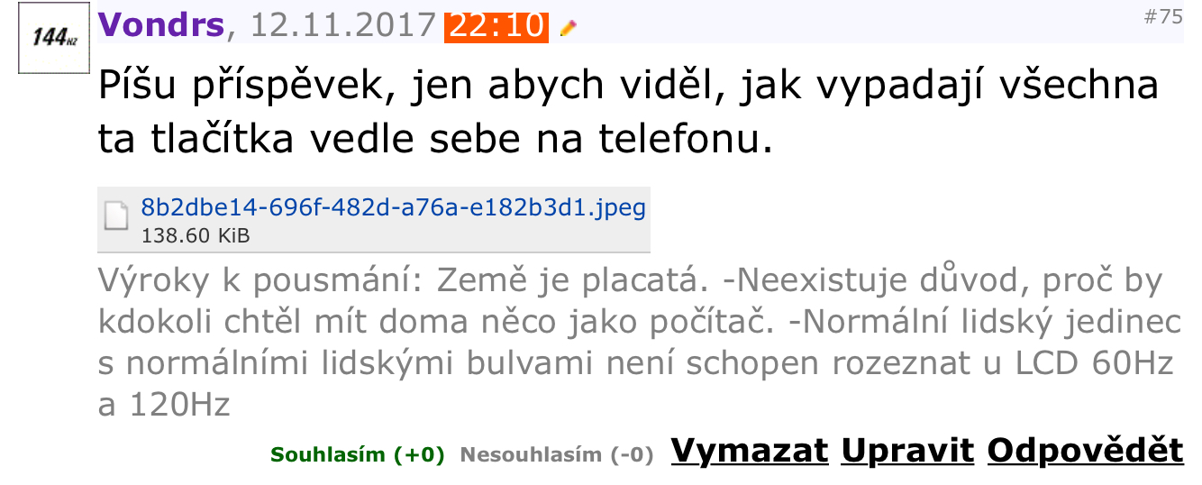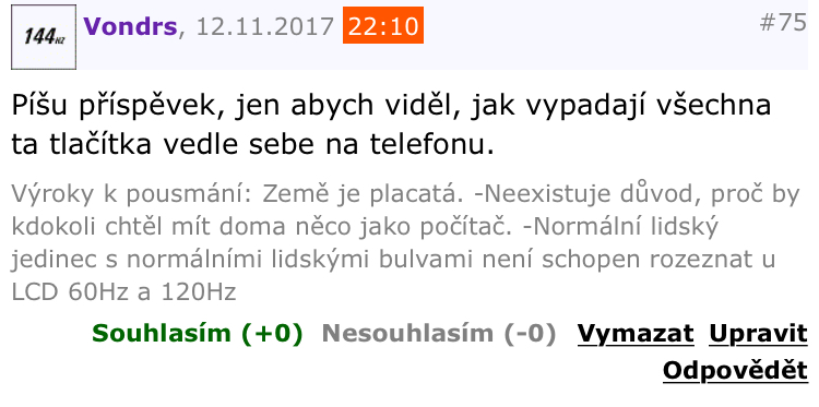 A čo na mobile? Tam jako mám mať polku displeja len tlačítka súhlasím, nesúhlasím, upraviť, vymazať, odpovedať atď (ako napr. hore) ešte nejakú reklamu, a vidím tam 2 písmenka z príspevku, a abych si pozrel ďalšie 2 písmenká tak musím scrollovať? Fakt už tu chýba len pridať reklamní banery alebo nejaké iné prvky medzi každý príspevok. A bude to dokonalé, ne ešte nebude, ať to ešte bliká.
