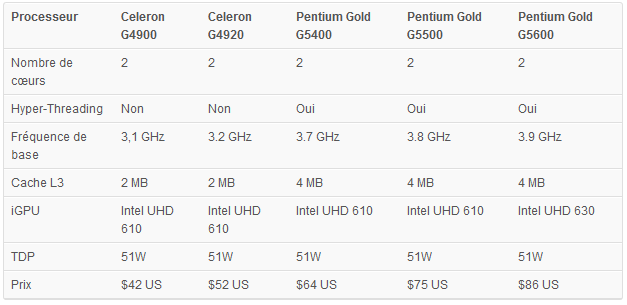 • Rodina novych procesoru Pentium a Celeron, budou v cenovém zebricku mezi 40 a 90 dolary. Jako IGP chip maji osazen Intel UHD@610 tedy az na vyjimku Pentium Gold G5600 ktery bude doprovazen s Intel UHD@630