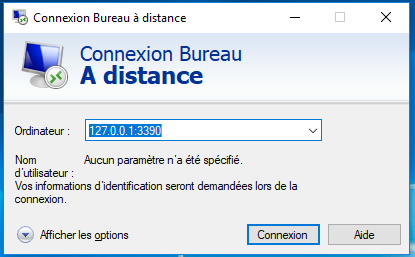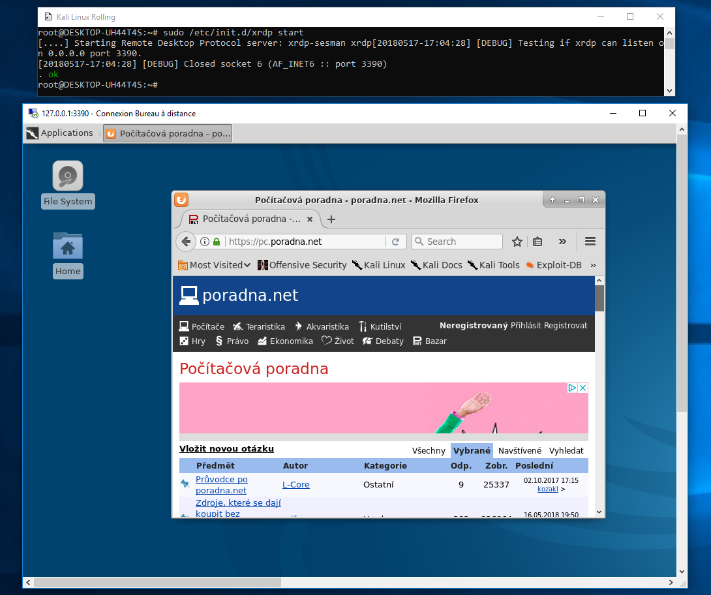 sudo /etc/init.d/xrdp start- Po spusteni vam napise ktery PORT mate pouzit (zpravidla nabizi 3390), jelikoz je spusten na nasem LOKALNIM PC, pouzijeme IP adresu 192.168.0.1, nebo lokalhost + port, coz nam da kupikladu 192.168.0.1:3390, coz pakRDP vypada jako :