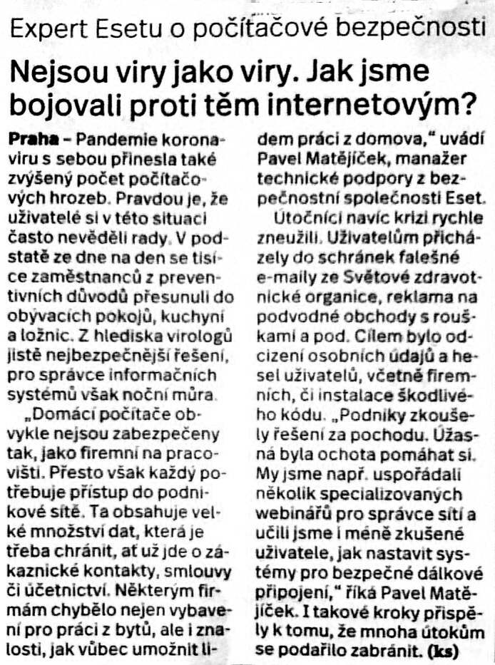Urcite ma clovek z Esetu pravdu v tom, ze firmy nebyly casto pripraveny na moznost, ze by lide zacali pracovat z domova. Fleg tu popisuje ponekud extremni priklad z praxe, u nas byl hlavne problem v te rychlosti, kdy najednou se v pondeli reklo, ze se od utery nebude chodit do prace a IT melo do konce pracovni doby toho prvniho dne, takze nejakych 7-8 hodin casu, kdy meli zajistit, aby lide mohli pracovat z domova.