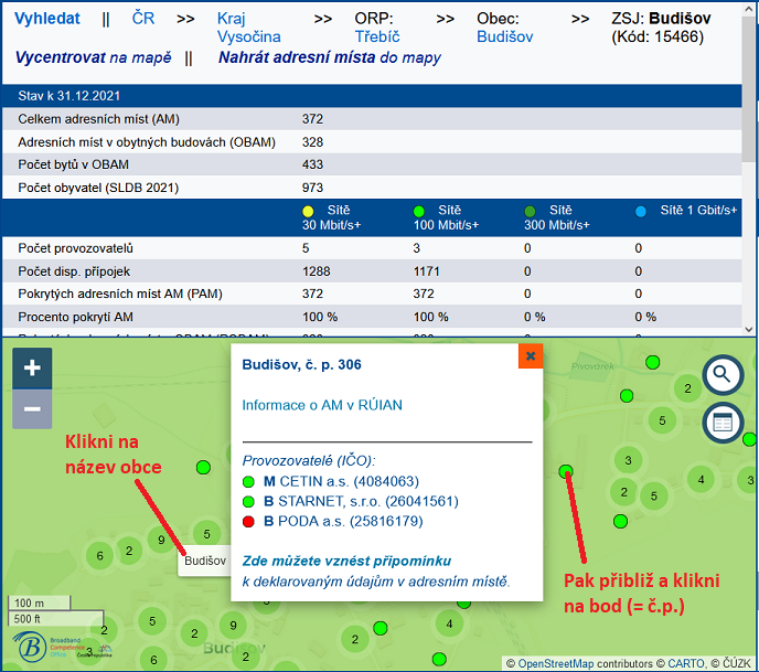 Po vyhledání obce (nebo dostatečném přiblížení mapy) klikni na název obce v bílém obdélníku. Objeví se horní přehledová tabulka poskytovatelů a "rozsvítí" se body, představující jednotlivé adresy. Většinou budeš potřebovat další přiblížení, body jsou seskupovány dle měřítka: