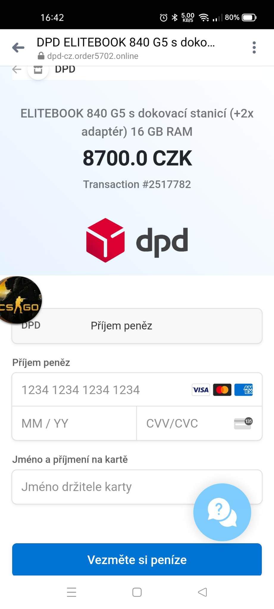 Následně se zobrazil údajný průběh placení, a jakmile bylo dokončeno, objevila se mi další stránka: