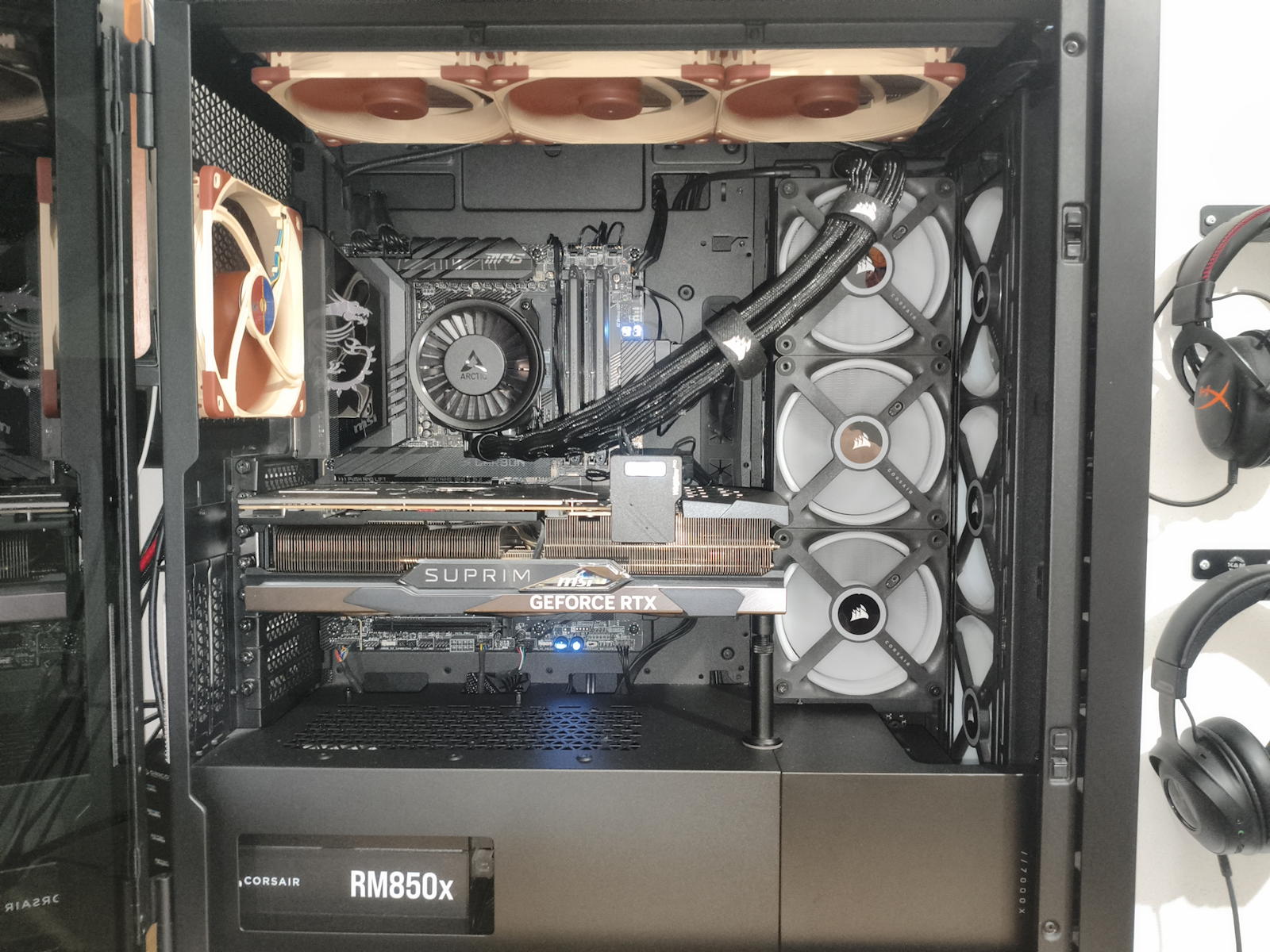 Libi se mi celkove zakonceni a cistoty na urovni kablaze. Zpravidla ty Trio FAN s pumpou AIO davam nahoru, ale v te vertikalni pozici, celne to vypada docela dobre navic je to prakticke protoze AIO nasava cerstvy vzduch z tech prednich Coirsaru coz si myslim umoznuje udrzet CPU na korektnich hodnotach.