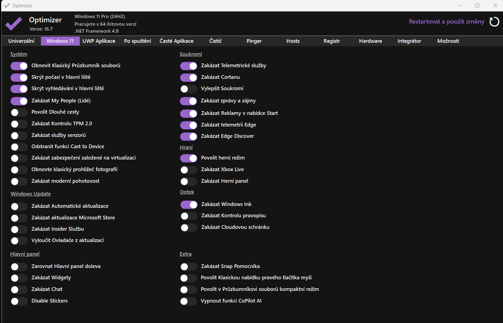 • Dal by ses dozvedel, ze "kdyz uz", tak jako pouzitelnou APP jsem nedoporucoval "Optimiser" ale "WinUtil" : https://github.com/ChrisTitusTech/winutil/releases, ktery staci stahnout a pustit winutil.ps1 v Powershell.