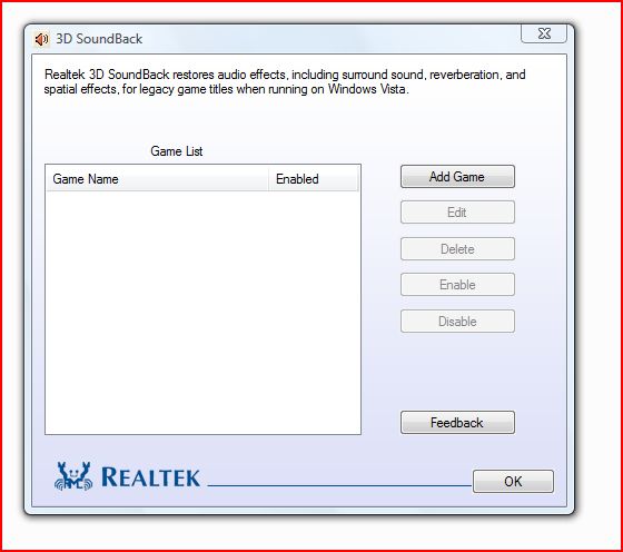 na stránkach realteku je k dispozícii doplnok k ovládačom zvukových kodekov realtek 3DSoundBack na obnovenie nastavení surround sound a audioefektov v starších hrách pod windows vista,je to obdoba creative alchemy pre creative karty,pracuje prakticky rovnakým spôsobom, nainštaluje sa do zložky program files do adresára realtek a spúšťa sa manuálne *.exe súborom,možno to bude pre niekoho zaujímavé,možno nie....