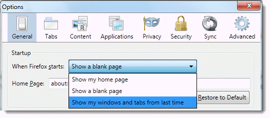 ) Keby dačo, tak v SK FF 4.0 sa to volá "Po spustení prehliadača Firefox zobraziť: naposledy otvorené okná a karty" a pôvodne tam je "domovskú stránku"