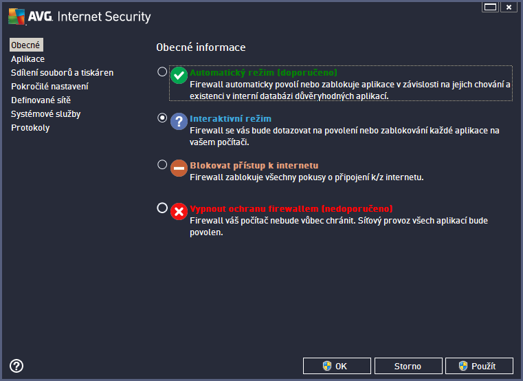 Používám (WinXP) aplikační firewall AVG (windowsácký mám vypnutý). Při přechodu mezi minulými verzemi (2010-2011-2012) se nastavení pravidel pro jednotlivé aplikace vždy zkopírovaly do vyšší verze. Teď, při přechodu na AVG 2013 nastala změna. Po instalaci je defaultní nastavení "Automatický režim". Interaktivní režim (=kontrola nad každou aplikací) je prázdný (kromě AVG) a je nutno všechny aplikace, snažící se přistupovat na internet, znova povolovat/zakazovat. Zbytečná otrava :-|