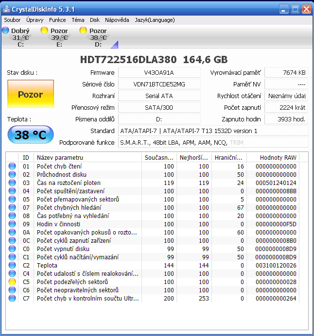 Ahoj,mám v počítači 3 HDD a po nainstalování Crystal disku mi to hodilo toto (viz fotka)Takže se mám připravit na stráty dvou Harddisků?