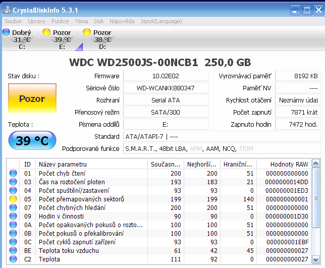 Abys nerekl, tak ta chyba myslim 05 (premapovane sektory vadi), pro jistotu bych zazalohoval data, urcite pozoruj, zda tam bude pocet premapovanych sektoru pribyvat, jestli ano, tak jde opravdu disk do kelu. Chybu C5 (podezrele sektory) taky pozoruj, zda nenarusta, jinak ale tahle chyba se stava casteji a nemusi to vzdy znamenat konec disku, tedy za predpokladu, ze nebude narustat - chyby se da zbavit bud formatem disku, ne vzdy pomuze, myslim, ze to neni WD tak nevim jestli pujde pouzit Data Lifeguard Diagnostic od WD, ale kdyz das test, tak tam mas quick test, extended test a write zeros a prave tim poslednim se da te chyby C5 zbavit, na disku samozrejme nesmeji byt data (prijdes o ne), pokud bude ale disk nakopnuty a nebyla to nahodna chyba, tak se tam brzy zase vytvori znova.