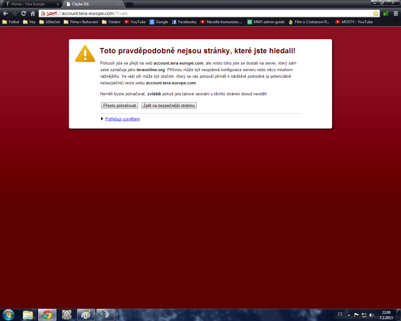 To ze je to neduveryhodne, uz mi nepise to jsem opravil tim ze jsem ten certifikat pridal mezi duveryhodne, ale psalo mi to v okamziku kdyz jsem kliknul na techto strankach tera-europe.com kliknul nahore na my accont! Ted mi to pise Toto pravděpodobně nejsou stránky, které jste hledali! a pak mam jen 2 moznosti dat presto pokracovat nebo zpet na bezpecnejsi stranku.