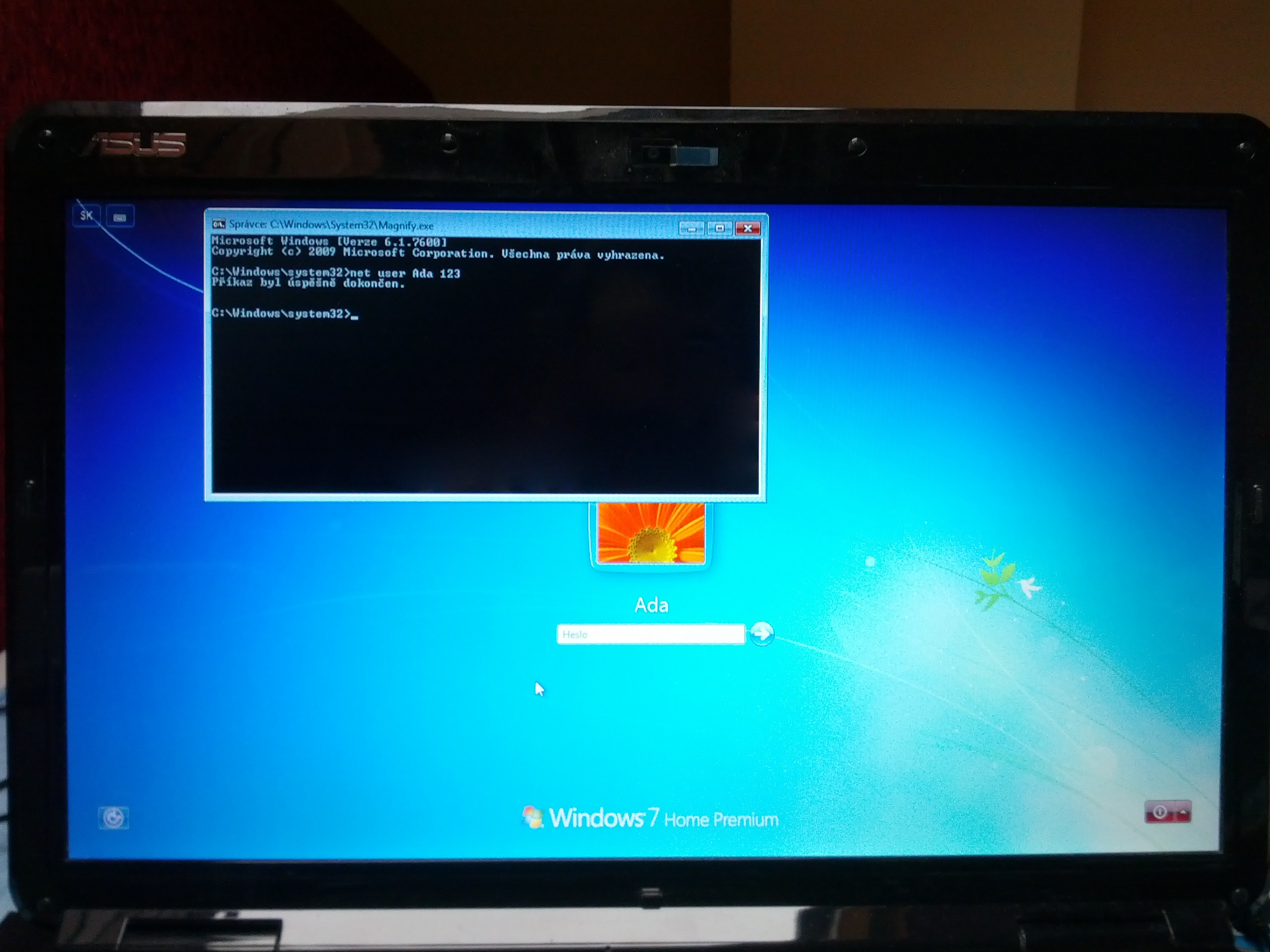 Po spuštění lupy v přihlašovací obrazovce tím spustím příkazový řádek s právama admina a heslo můžu změnit. Pak vše vrátim do původního stavu
