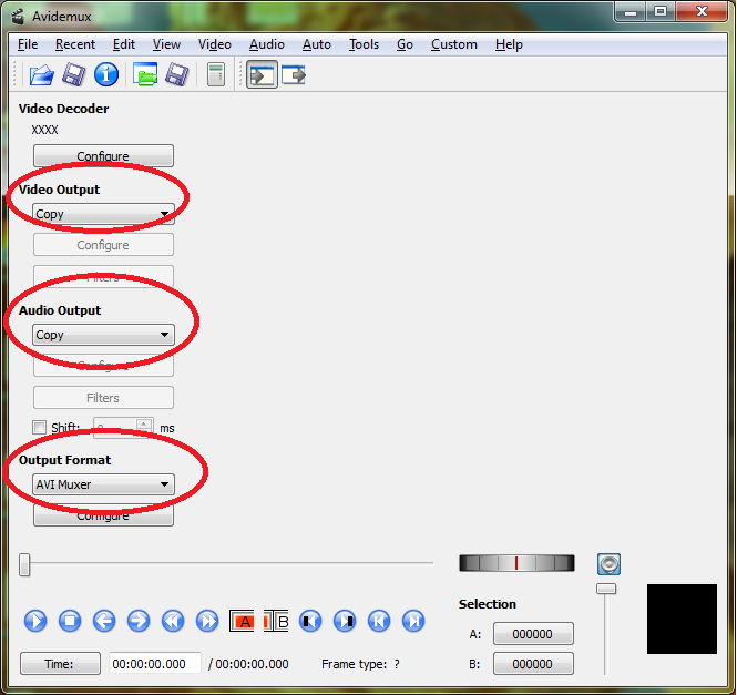 Ne, žádný output tam není, jen ten video decoder. Verze to je Avidemux 2.6.