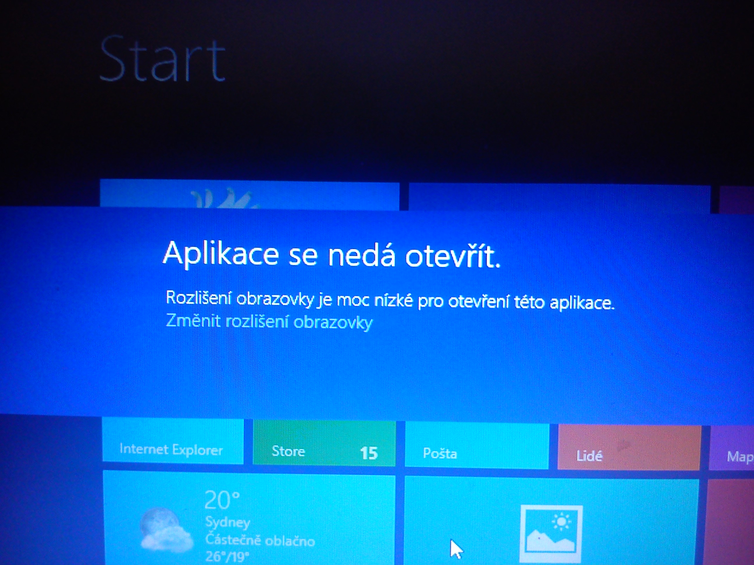 Když jsem W8 nainstaloval začal sem tím že jsem stáhnul všechny dostupné aktualizace, poté sem chtěl otevřít jednu z dlaždic v hlavním menu a psalo mi to že mam moc malé rozlišení a že to nelze spustit.