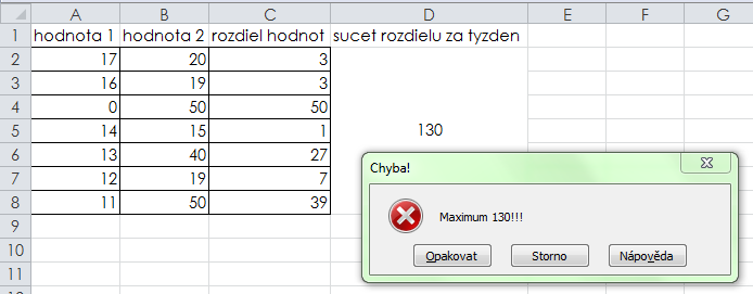 V stlpci A- B mam hodnoty. V stlpci C sa mi zobrazuju vysledky (=SUM(B-A)), no a v stlpci D mi spocitava stlpec C po 7 riadkov.