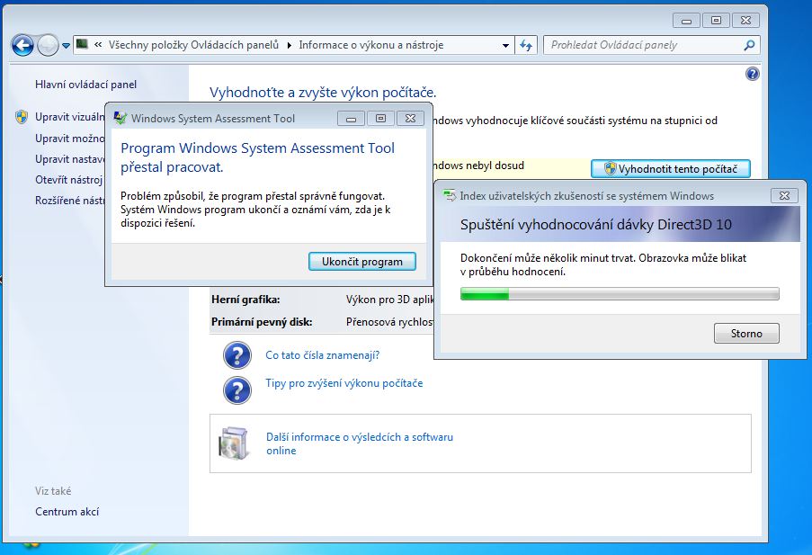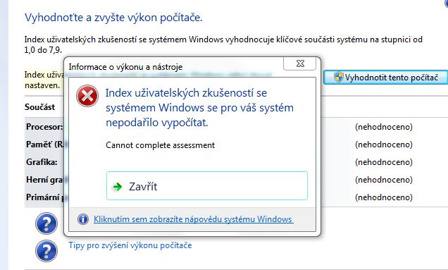 Píši to sem, kdyby měl někdo stejný problém, protože jsem nic podobného na internetu nenašel. Neděkuji za pomoc dvoum rádcům, co radši radili at to nepoužívám... Doufám, že to bude někomu nápomocné kdyby se setkal se stejným problémem. (PS. někde se radí mazat složku DataStore z c/win/performance/winsata/... nedelejte to,nema to vliv, naopak vam nepujde poustet hodnocení už vubec. Dávám vyřešeno.