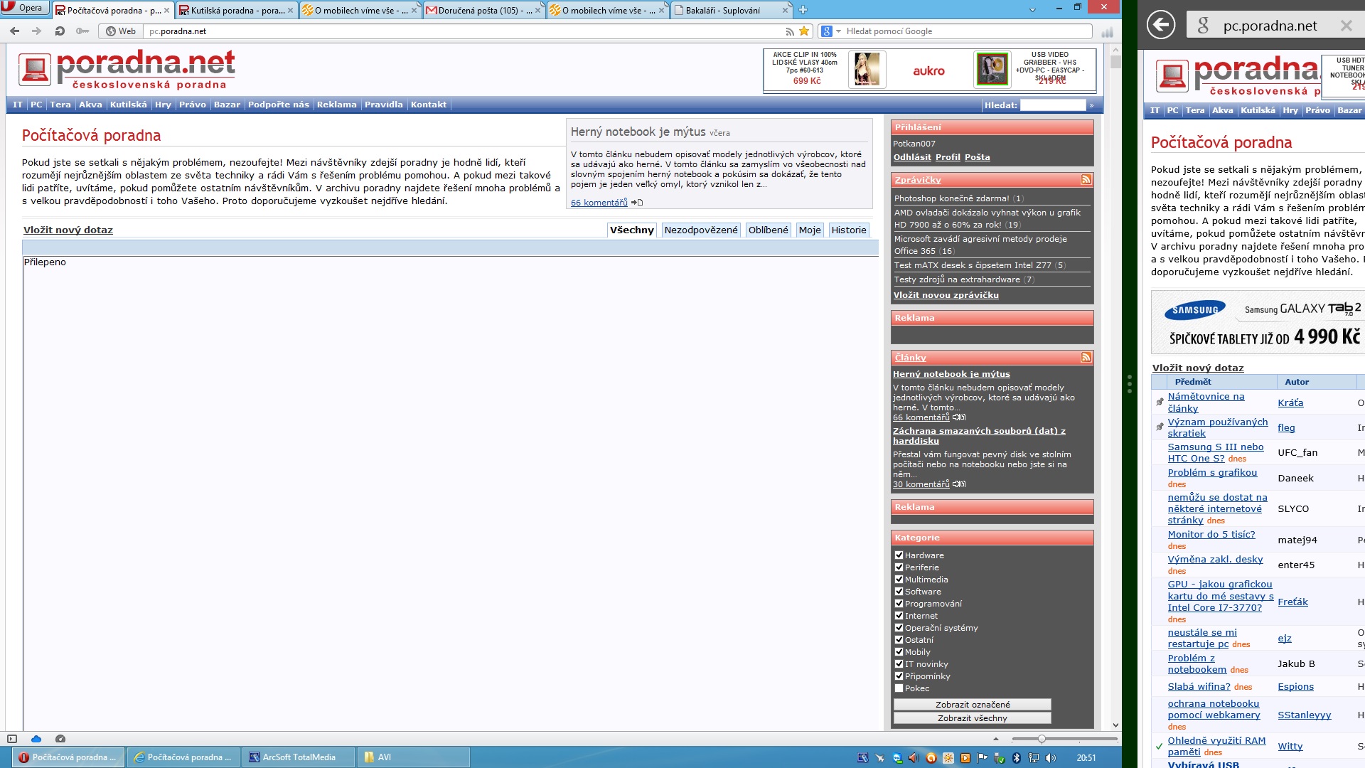 V testovacím profilu se PC poradna načte, tak jdu řešit problém u sebe. Jak je ale možné, že se projevilo to samé na dvou nepropojených počítačích s různým OS? Opera Link na tomhle novém ještě nemám přihlášený, takže vlastně fungují nezávisle na sobě, jediné, co je spojuje, je můj účet na poradně.