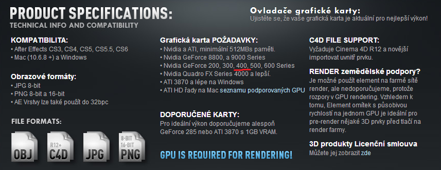 mám problém týkající se softwaru Adobe After Effects + plug-inu Elements 3D. Po nainstalování tohoto pluginu spustím program, aktivuji. Vše proběhne v pořádku. Avšak po následném vložení efektu (pluginu) na dané video se mi objeví.. (obrázek) . Píše se tam o tom, že moje graf. karta (GeForce GTS450) to neutáhne, přitom to nemůže být pravda. Mám na výběr ze dvou možností. Při jakékoliv volbě se program ukončí.