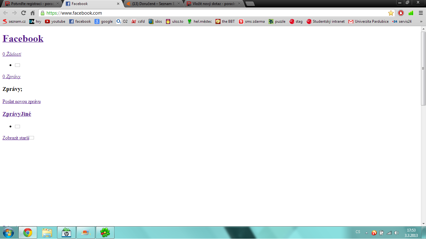 Ahooj, potřebovala bych poradit. Občas se mi nezobrazují stránky facebooku a youtube. Na počítači mi to jde normálně, ale na notebooku mi to občas nejde. A to jenom když jsem připojená doma na wifi. Když se připojím ve škole tak mi to jde normálně. Připojila jsem obrázek jak se mi to zobrazuje. Děkuju za odpovědi.