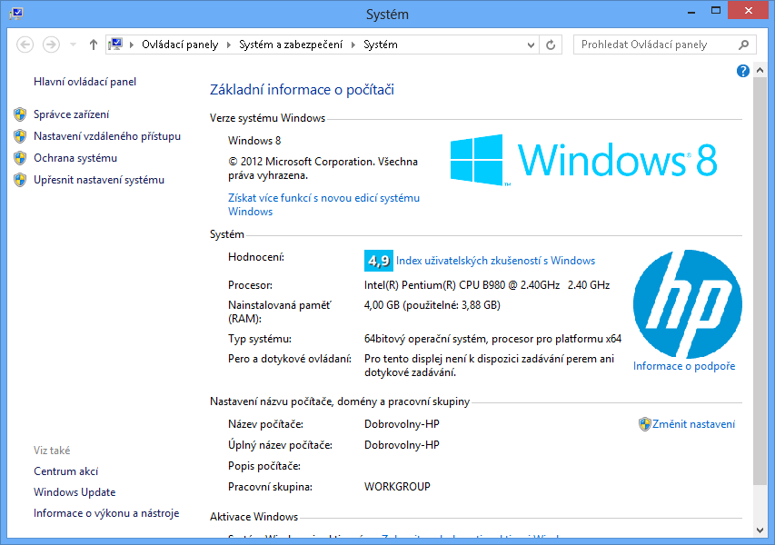 Pokud ve Win dám Počítač vlastnosti, vidím tam: Windows 8, 64bitový operační systém, procesor pro platformu x64.