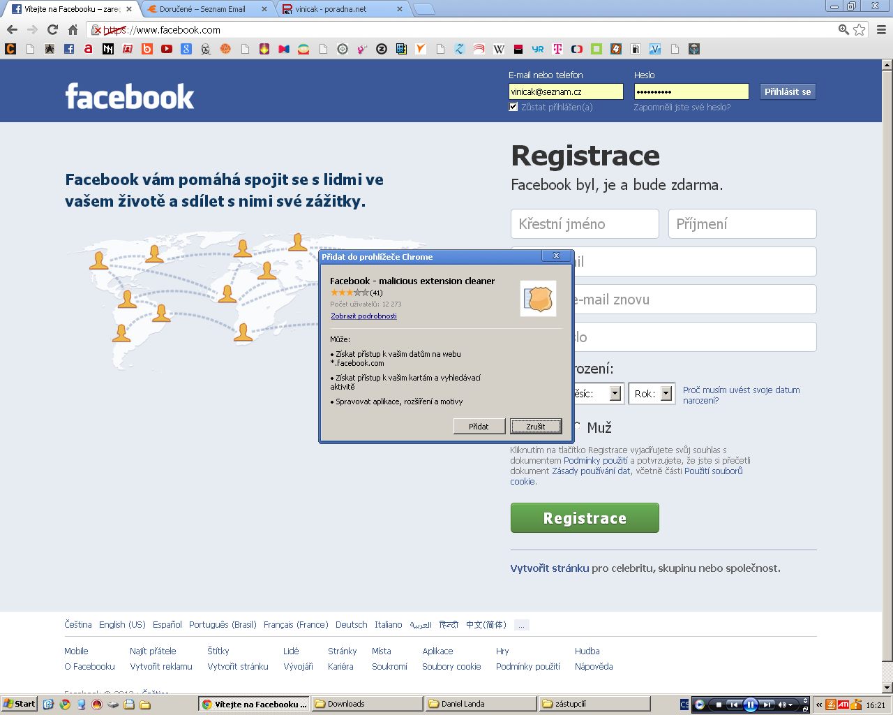 Otevri si ten prvni odkaz v Chrome a uvidis, co za kur.vu sis do pc nainstaloval. Odinstaluj to super rozsireni a na FB se bez problemu prihlasis. Precti si hlavne komentare uzivatelu tohoto rozsireni.
