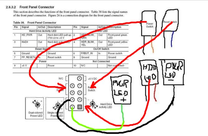 Mam problem se zapojenim predniho panelu viz obrazek. Napravo ty zasuvky (sry nevim jak se tomu rika) jsou ty ktere mam v komplu (cerny kabel = bila) ale vubec nevim jak je do ty desky zapojit protoze se nektere jmenuji uplne jinak oproti tomu jak se jmenuji v manuale (napr Pwr (power) led + a -)